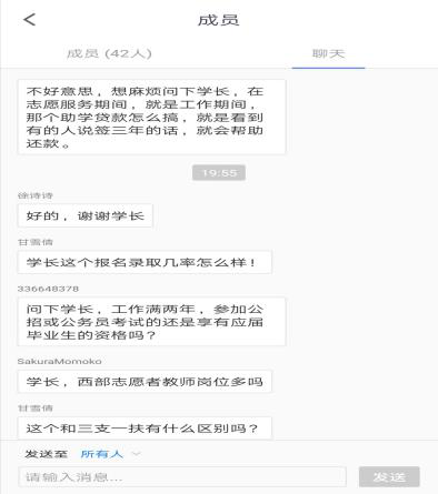 4月28日19时30分,交流会准时开始。朱凌校友主要从西部计划实施的时代背景、考选流程、报考时间节点、从事工作岗位、工资待遇、西部计划的优惠政策和未来职业规划这六个方面和同学们进行了详细的交流,同时与同学们积极互动,认真回答了同学们提出的各种问题,包括个人职业发展如何和西部计划紧密连接、考研和西部计划是否冲突、工作环境和工作岗位如何选择等。