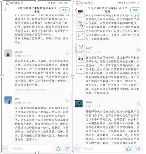 通过本次课程,同学们对我国的社会主义核心价值体系以及社会主义核心价值观有了更加深入的认识;师生在课堂上的积极互动让同学们将本堂课的授课内容在轻松活跃的氛围中牢记于心。吴涯副教授备课充分,PPT制作精良,课堂气氛活跃,讲课慷慨激昂,深受同学们欢迎。课后,同学们纷纷在网络平台上表达自己的看法。