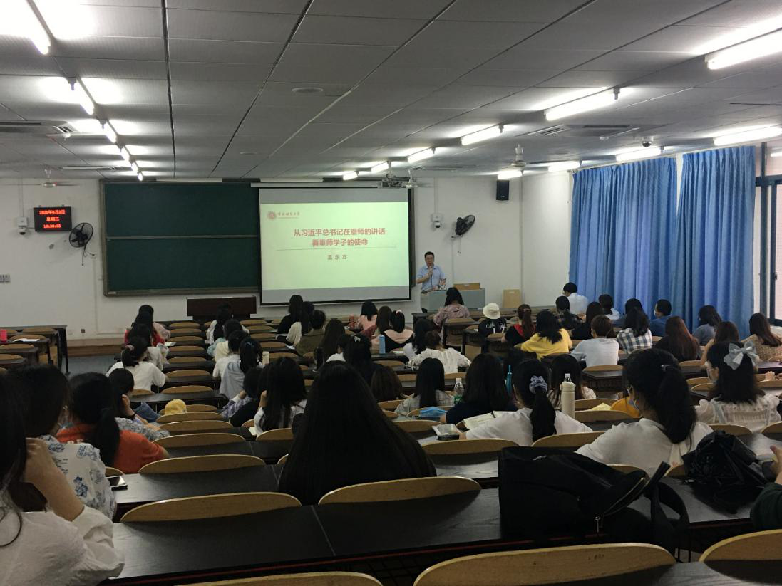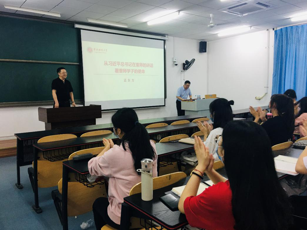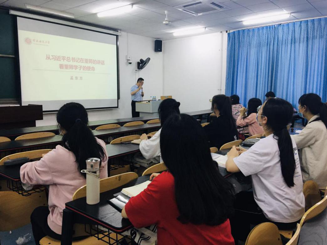 在新冠肺炎疫情总体得到控制的情况下,我校陆续有序恢复线下教学工作。2020年6月3日晚,《习近平新时代中国特色社会主义思想》全校通选课第四期第12讲、本期线下教学第一讲在砺志楼2208教室开讲,校长孟东方教授以“从习近平总书记在重师的讲话看重师学子的使命”为题为同学们授课。PA视讯集团院长陈洪教授主持本次课程。