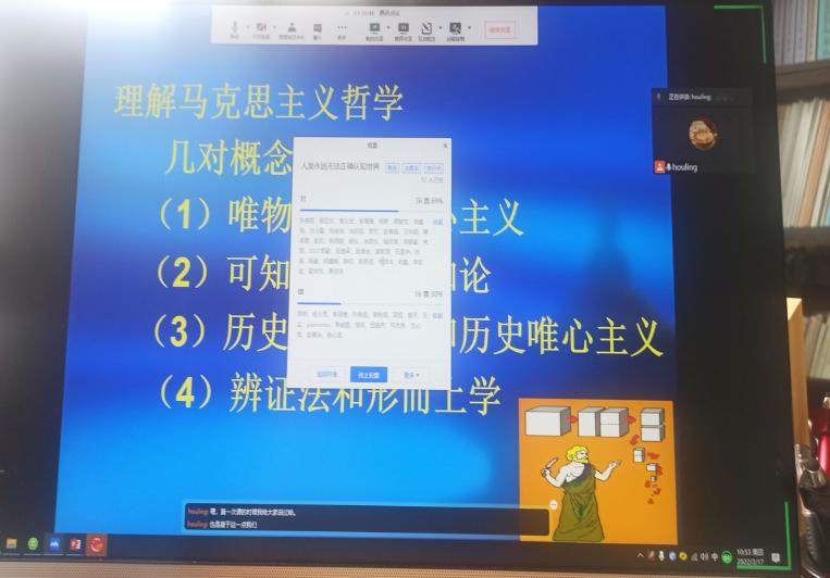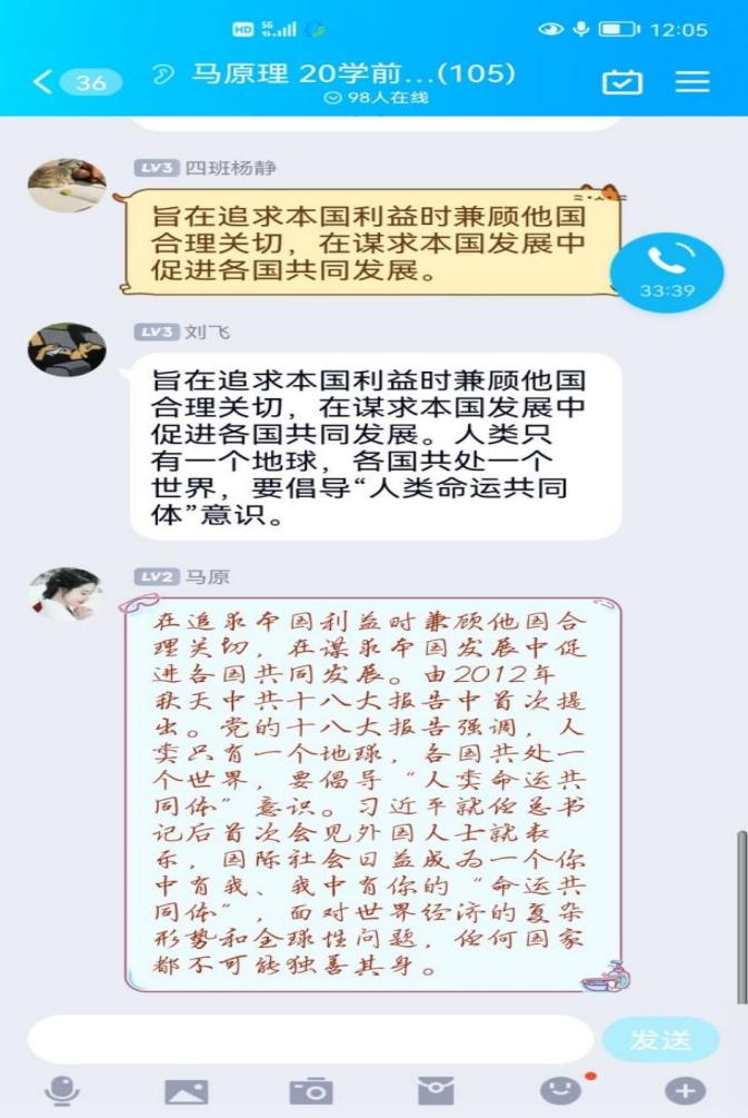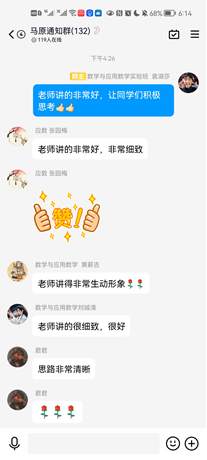第三阶段,线上互动阶段。老师们通常要留十五分钟左右的时间对学生的学习情况进行总结、答疑解惑。同时,还设置了抢答、辨析、讨论等形式检测学生对教学内容的掌握情况,对学生反馈出来的薄弱点,及时进行补充讲解。此阶段主要有两个任务:一是,以知识网络图为中心结合学生们在学习通中发布的问题,有重点有针对性的讲解相关知识。二是,讨论在课程准备阶段给出的案例与情境性问题。这一阶段的教学在QQ群、微信群、钉钉群中以直播互动的方式进行。