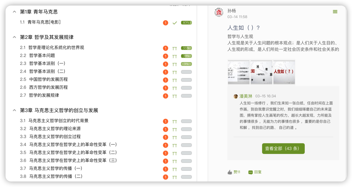 第二阶段,学生自主学习或直播课堂阶段。学生按照课程进度利用上课时间段或其他时间分散自主学习超星学习通和至善网中老师事先传到平台上的视频、PPT、文档等学习资料,提交相关作业和知识网络图,并将学习过程中的问题发布到学习通讨论区中;或者教师直播课堂阶段。