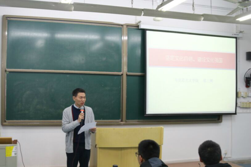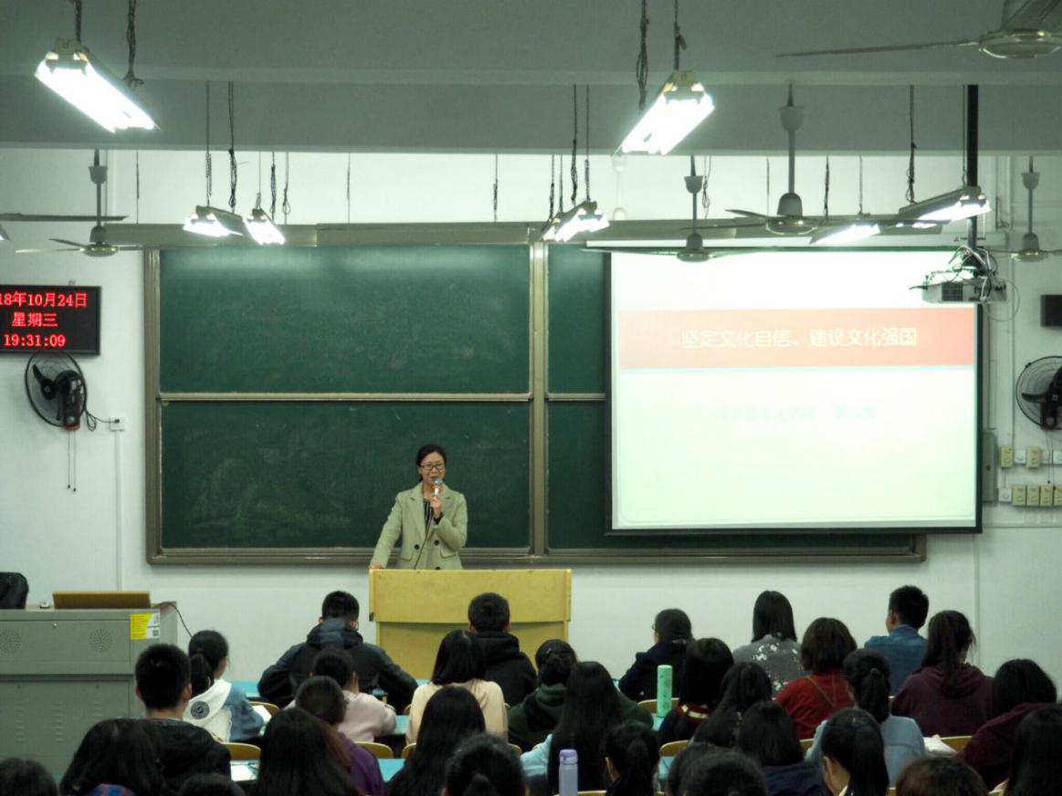 为使学生坚定文化自信,深入贯彻落实习近平新时代中国特色社会主义思想响应国家建设社会主义文化强国的号召,2018年10月24日晚,“习近平新时代中国特色社会主义思想”通选课在弘德楼15103教室继续进行第五讲,由PA视讯集团《毛泽东思想和中国特色社会主义理论体系概论》教研室主任、博士邵二辉副教授主讲,主题是“坚定文化自信,建设文化强国”。讲座由学院党委副书记姜土生主持。