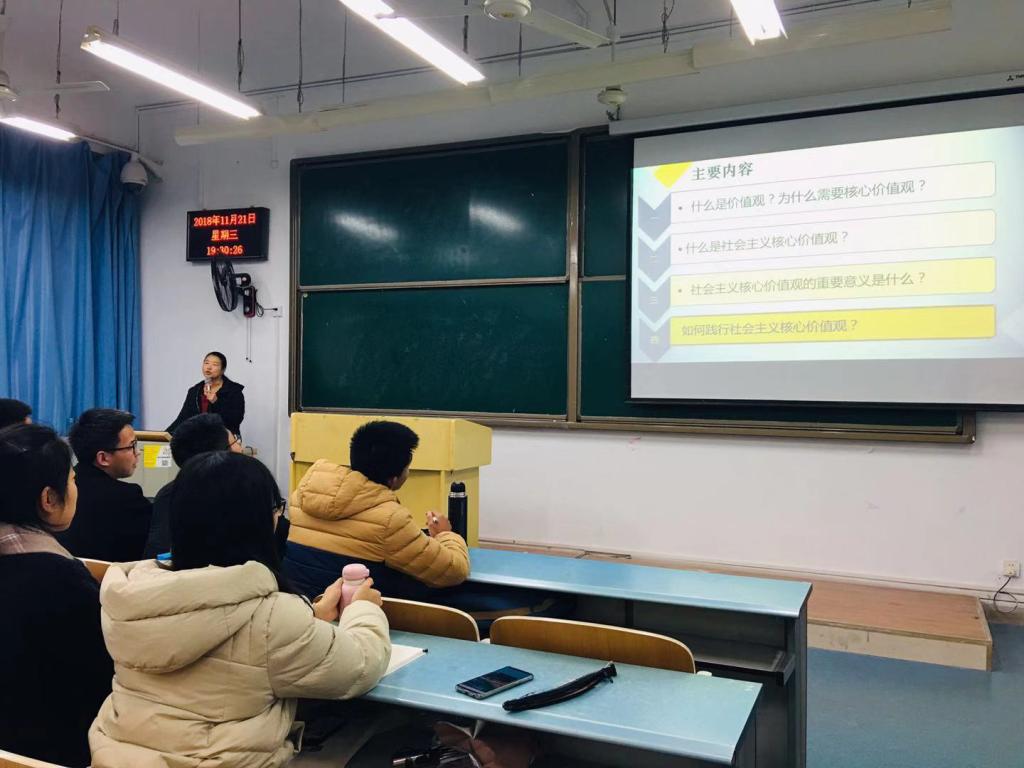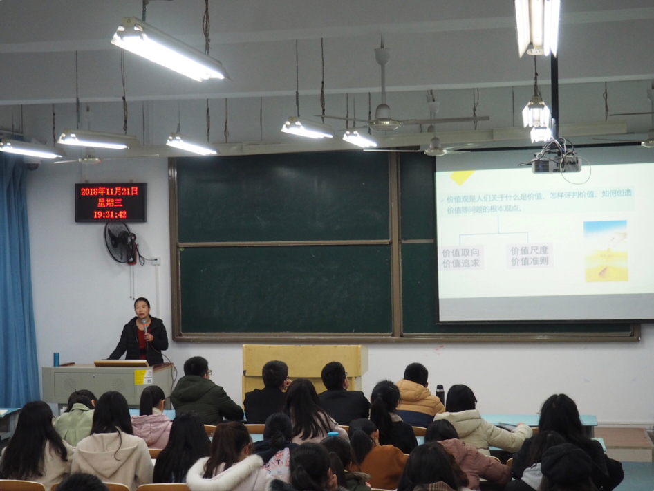 吴涯副教授从“什么是价值观?为什么需要核心价值观”、“什么是社会主义核心价值观”、“社会主义核心价值观的重要意义是什么”、“如何践行社会主义核心价值观”等四个方面展开。首先吴涯副教授通过一个价值观的测试激发同学们学习的兴趣,并通过设问的方式引发同学们对倡导核心价值观原因的思考,她指出:如果一个民族一个国家没有共同的核心价值观,莫衷一是,行无依归,那这个民族,这个国家就无法前行。接下来,吴涯副教授对社会主义核心价值观的提出过程以及富强、民主、文明、和谐、自由、平等、法治、公正、爱国、敬业、诚信、友善24字基本内容结合简短视频进行了逐一解读。关于社会主义核心价值观的重要意义,她强调:社会主义核心价值观是当代中国进步的精神指引,是坚持和发展中国特色社会主义的价值遵循,是提高国家文化软实力的迫切要求,是增进社会团结和谐的最大公约数。最后,吴涯副教授寄语同学们在今后的学习生活中要勤学,修德,明辨,笃实。