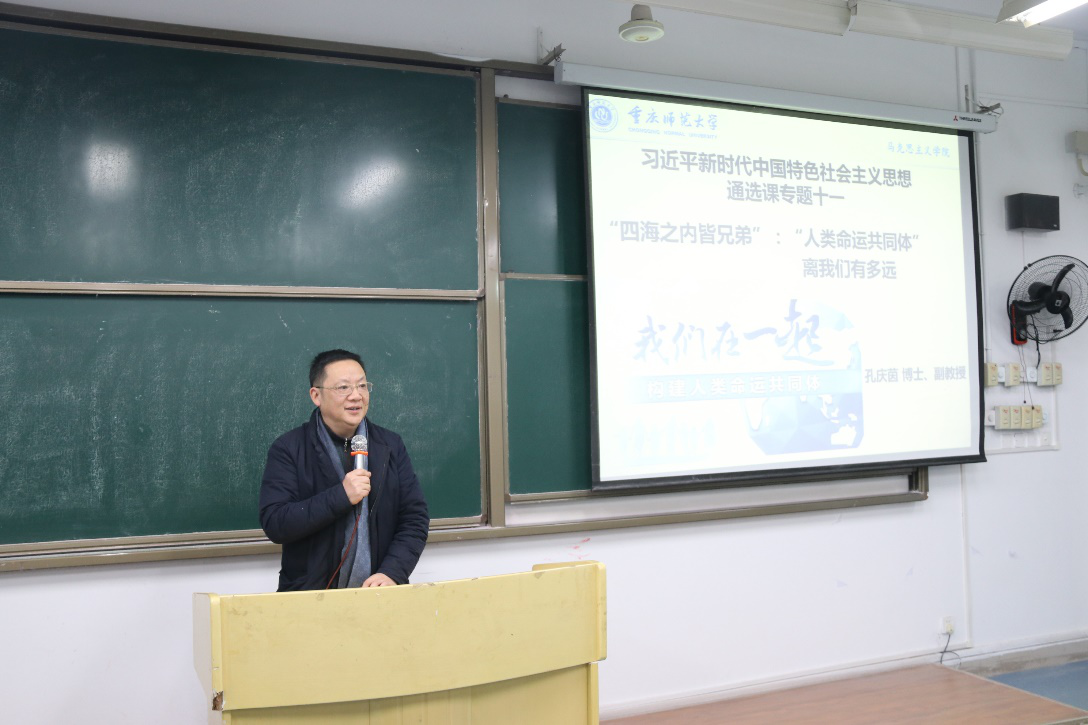 2018年12月5日晚,“习近平新时代中国特色社会主义思想”通选课在弘德楼15103教室继续进行第十一讲。本次讲课由PA视讯集团思想政治理论课教研部主任孔庆茵副教授主讲,主题是“四海之内皆兄弟”:“人类命运共同体离我们有多远”。讲座由学院院长陈洪主持。