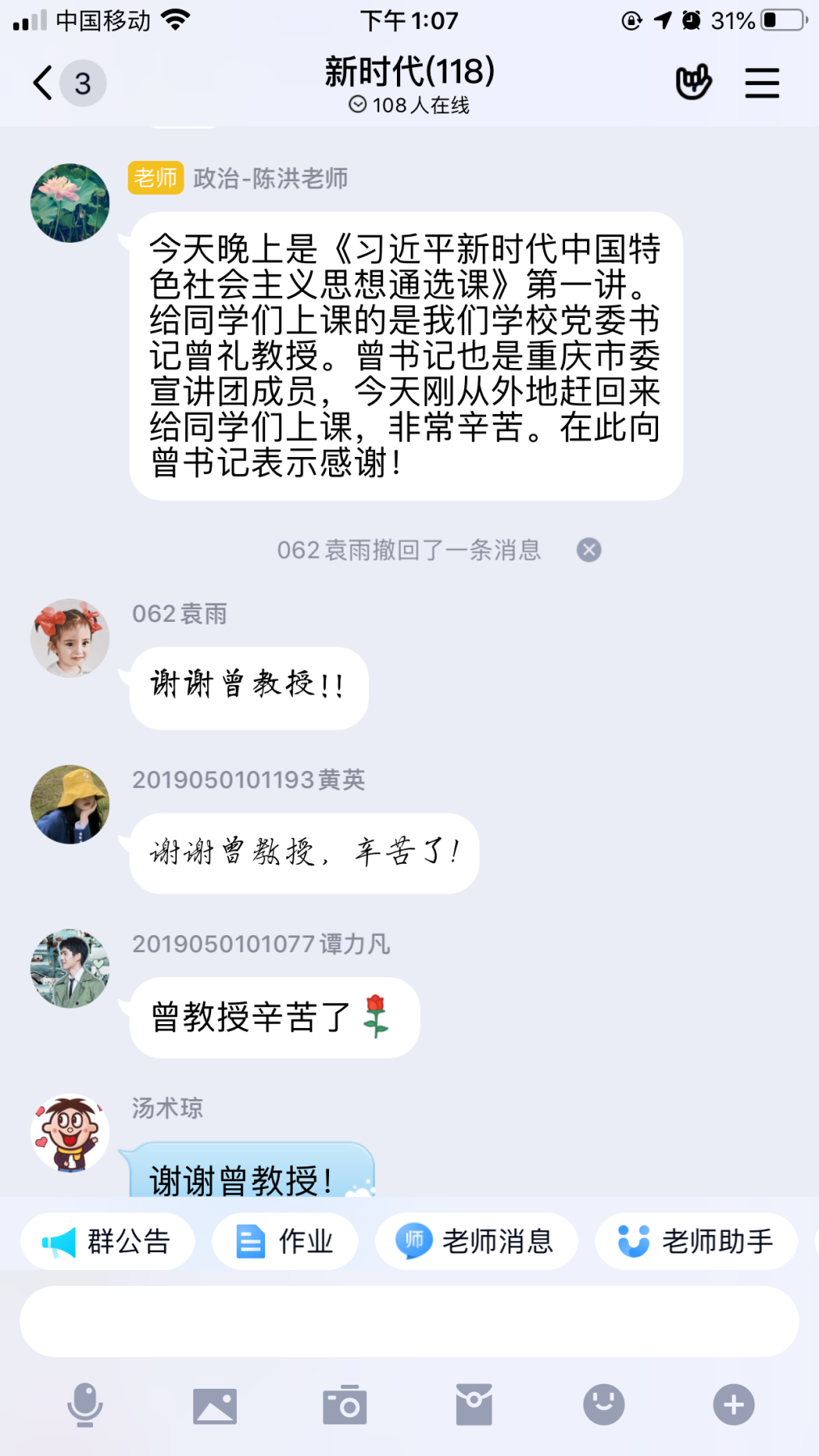 今年年初肆虐的新冠肺炎疫情,在以习近平总书记为核心的党中央的坚强领导下,全国人民团结一致,战胜此次疫情指日可待。鉴于此,高校都推迟了开学时间,但“停课不停学”的方式让同学们宅在家里也能完成相应的学习任务。《习近平新时代中国特色社会主义思想》从2018年9月开设以来已经完成了三期,这学期是第四期。校党委书记曾礼教授参加了每一期的授课,受到同学们的热烈欢迎和好评。为了准备好此次在线课程,曾礼教授多次在QQ群课堂直播进行设备的调试、资料准备等相关准备工作。同学们盼望已久的线上教学第一讲于2020年3月18日晚19时30分准时通过QQ群课堂录播形式开讲了。本次课程由重庆师范大学党委书记曾礼教授进行讲授,选课同学准时积极参与。