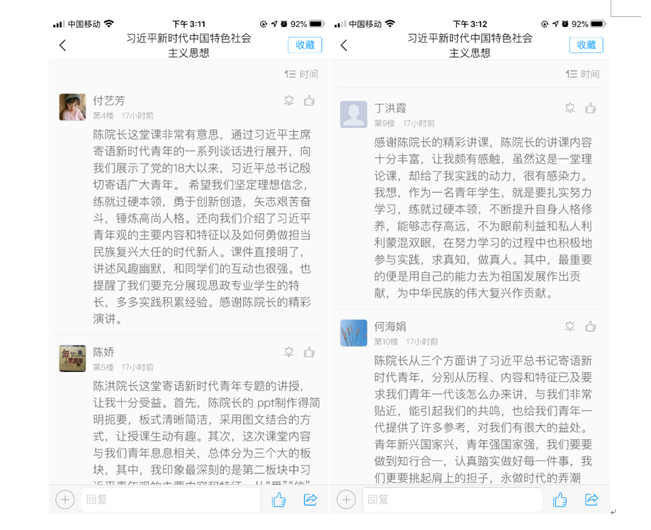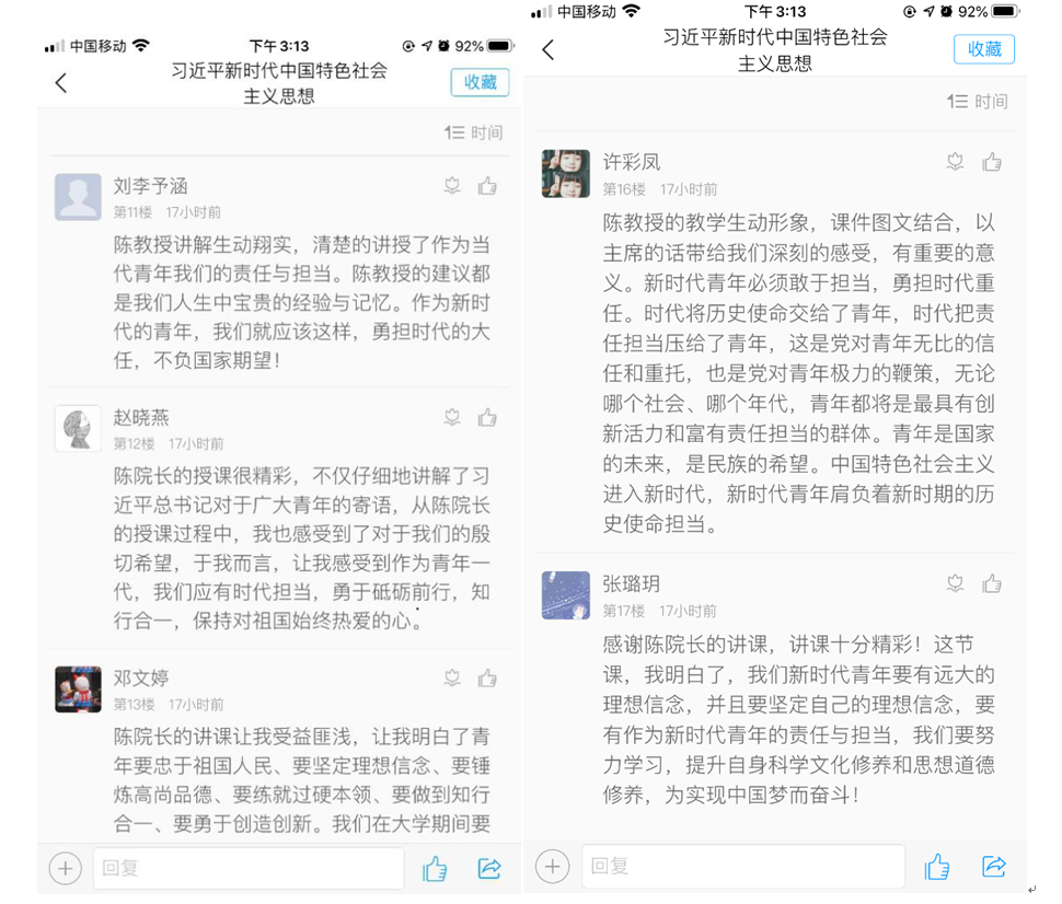 在授课过程中,陈洪教授备课充分,PPT制作精美,讲课充满激情,思路清晰,娓娓道来,案例贴近学生实际,紧密结合现实,紧跟时代潮流,教学中实时与学生开展互动,及时进行育人和思想引导,为大家呈现了一堂精彩的直播课。线上教学结束后,同学们对陈洪教授这堂具有政治高度、理论厚度和感情温度的习近平新时代中国特色社会主义思想专题线上教学课给予了充分肯定,纷纷在平台留言表达自己的感想。