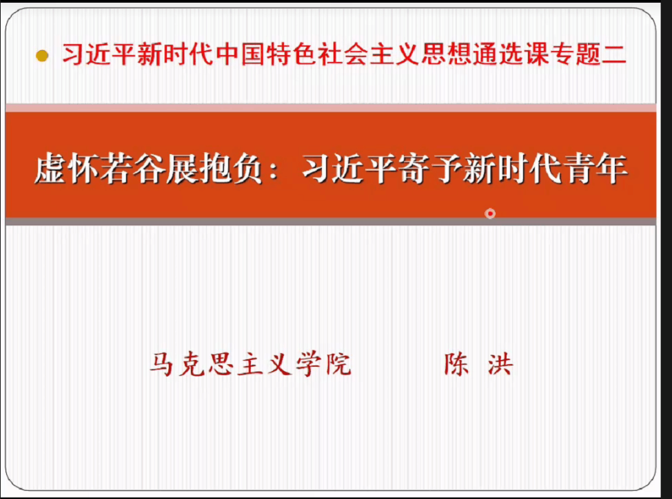 本次课程以党的十八大以来,习近平总书记对广大青年的寄语、习近平青年观的主要内容和特征、勇做担当民族复兴大任的时代新人为主要内容。陈洪教授以2010年12月7日时任国家副主席的习近平同志视察重庆师范大学并在图书馆的讲话为开篇切入点,引起了同学们的兴趣。随后,他梳理了十八大以来习近平总书记在航天城、北京大学、中国政法大学、十九大报告、全国教育大会、纪念五四运动100周年大会、给援鄂医疗队全体“90”后党员的回信等讲话,总结提炼了习近平总书记对广大青年人的殷殷寄语。接着,用“爱”“信”“德”“能”“行”“新”六个关键字对习近平青年观的主要内容和特征进行了概括和深入阐释。最后,他希望同学们一定要牢记习近平总书记的谆谆教诲,要以革命理想高于天、初心永远不能忘、崇德修身放第一、自身本领要高强、知行合一树形象来激励自己、警醒自己、鞭策自己,不辜负总书记的殷切希望,做一名信念坚定、品德高尚、本领高强、素质全面、勇于创新、不懈奋斗的新时代青年。