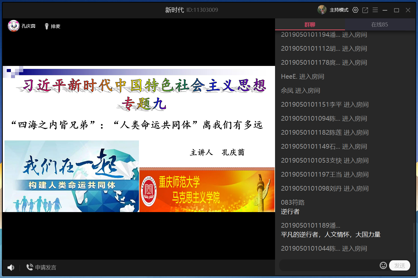 为深入学习习近平新时代中国特色社会主义思想,帮助学生更好地了解“人类命运共同体”并学会打造生活中的各种命运共同体,2020年5月13日晚,我校开展的全校通选课《习近平新时代中国特色社会主义思想专题摘编》第四期第九讲由PA视讯集团孔庆茵副教授主讲,讲课主题为“四海之内皆兄弟”:“人类命运共同体”离我们有多遥远。本次授课采用了QQ群课堂的线上教学形式,选课同学按时参与了此次线上教学活动。