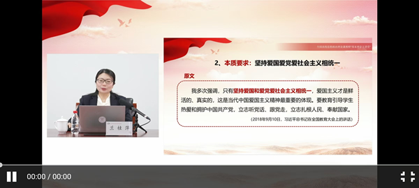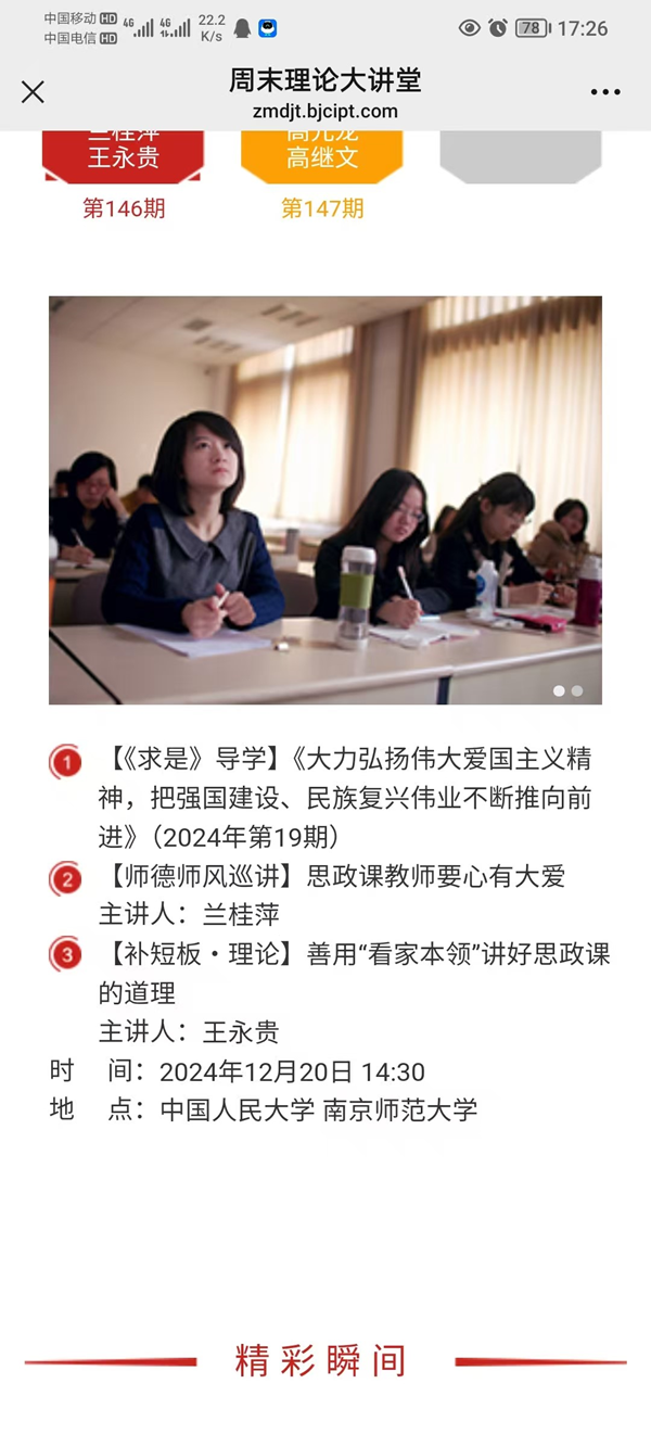 2024年12月20日,由教育部主办,全国高校思想政治理论课教师网络集体备课平台承办,北京高校思想政治理论课高精尖创新中心提供全程技术支持的“周末理论大讲堂”第146讲在中国人民大学举行。我院的全国优秀教师、兰桂萍教授受邀,面向全国思政课教师开展《<求是>导学:大力弘扬伟大爱国主义精神,把强国建设、民族复兴伟业不断推向前进》的主题授课和《思政课教师要心有大爱》师德师风巡讲。