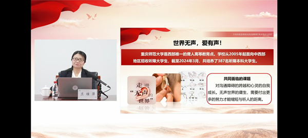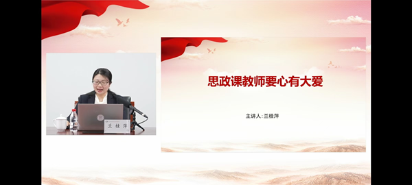 在以《思政课教师要心有大爱》为题的师德师风巡讲中,兰桂萍老师谈到:“教育是一门‘仁而爱人’的事业,爱是教育的灵魂,没有爱就没有教育。”她以自己的亲身经历,向全国思政课教师分享了在重庆师范大学这一西部唯一拥有聋人高等教育的学校,思政课教师如何努力过手语关、上互助课、做引路人,让爱跨越声音的界限,引领聋生向阳生长的动人故事。她强调,思政课教师要将爱心汇聚成助力思政事业发展的责任担当,要善于联动思政小课堂和社会大课堂,守正创新谱写思政教育新篇章。兰桂萍老师表示:“教育就是爱的传递,一名思政课教师就是一面旗帜,我们自己哪怕只是散发微光,也要照亮身边人,汇聚同行者,将理想信念根植于学生心中,启智润心、铸魂育人,努力践行和诠释一名思政课教师的初心和大爱。”