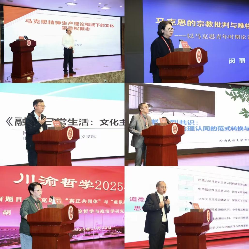 下半场主题报告由四川省马克思主义哲学史研究会会长、四川大学哲学系教授陈波主持,四川省马克思主义哲学史研究会荣誉会长、成都体育学院教授王民康点评。西南政法大学文学平教授以“马克思主义精神生产理论视域下的文化领导权概念”为题,强调只有把握文化生产的权力结构,才能在守正创新中坚持文化领导权,推动社会主义文化繁荣。四川大学闵丽教授以“青年马克思宗教批判与唯物史观形成—以马克思青年时期论著为中心的分析”为题,揭示了宗教批判在其转向市民社会剖析和唯物史观创立中的关键作用。电子科技大学欧阳彬教授以“融入日常生活:文化主体性的微观建构”为题,围绕文化主体性从常态化、具象化、话语化和制度化四个层面提出实践路径。西南民族大学段吉福教授以“从数据到共识:数智时代伦理认同的范式转换与危机应对”为题,主张构建“技术—人文”协同的伦理框架,以形成人机共在、多元共生的伦理新秩序。重庆社会科学院胡波研究员以“马克思论‘真正共同体’与‘虚假共同体’的本质区别”为题,剖析了马克思关于“虚假共同体”与“真正共同体”的本质区别。重庆师范大学李长泰教授以“中华民族共同体意识道德认同构建的四个维度”为题,重点从哲学依据、中华情感、道统文化、制度治理、精神理想等六大维度系统构建了铸牢中华民族共同体意识的实践框架。
