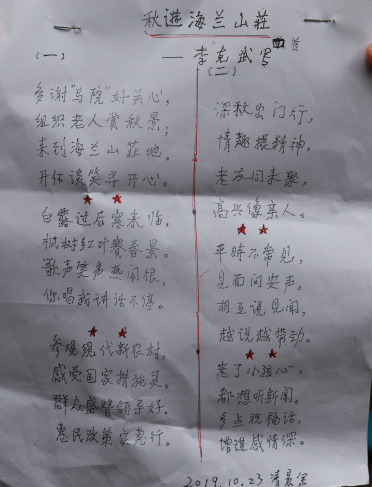 2019年10月23日上午,学院组织了一年一次的退休老同志秋游。小雨中的深秋,让人感到一丝丝冷意,地上还有些湿滑,10名老同志们克服困难,饶有兴致的随车前往金凤镇海兰云天。84岁的李克武老师兴奋得早上5:00过就起床,并在出发前用心写下《秋游海兰山庄》小诗四首送给学院,表达自己即将随学院秋游的喜悦心情。学院党委书记刘军、院长陈洪、工会主席李序科、工会委员高德华及党政办公室主任廖文梅一起陪同前往。