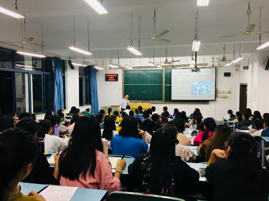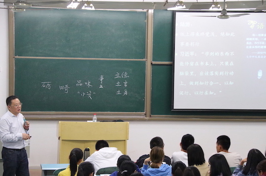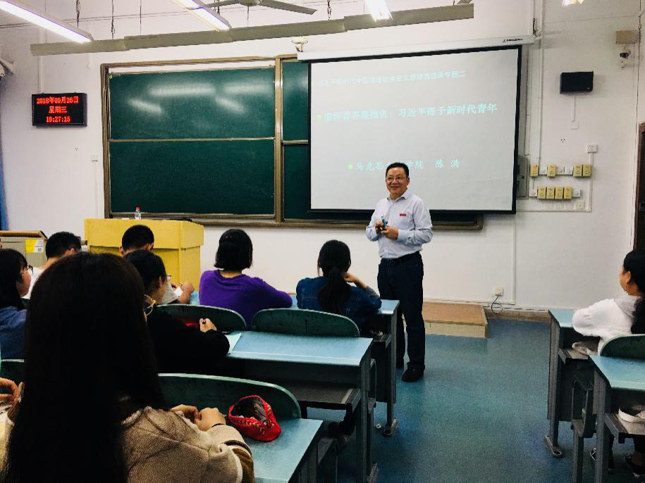 2018年9月26日晚,“习近平新时代中国特色社会主义思想”通选课在弘德楼15103教室继续进行第二讲,由PA视讯集团院长陈洪教授主讲,主题是“虚怀若谷展抱负:习近平寄予新时代青年”。讲座由学院思想政治理论课教研部主任孔庆茵副教授主持。