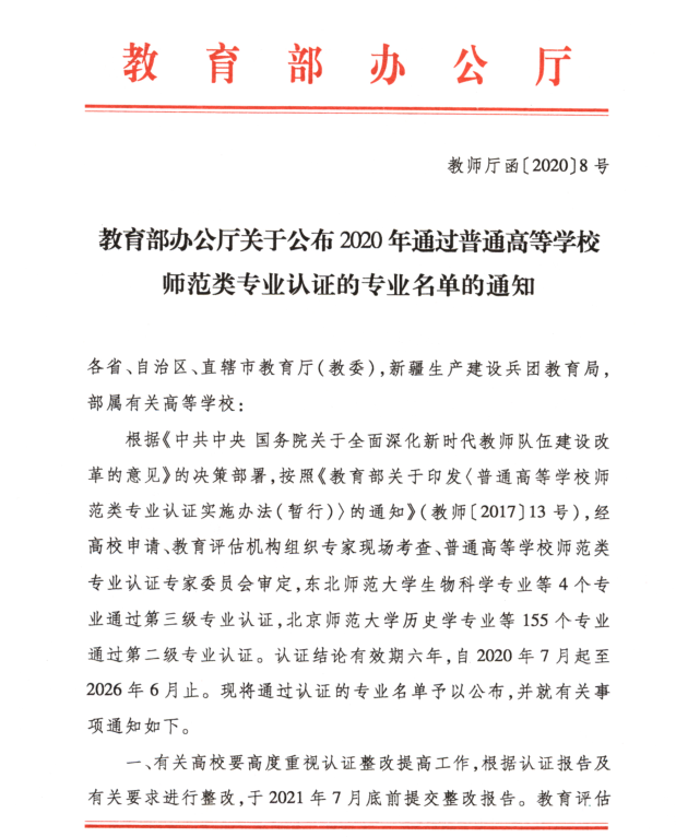 年通过普通高等学校师范类专业认证的专业名单的通知”,我院思想政治教育专业通过普通高等学校师范类专业第二级认证。