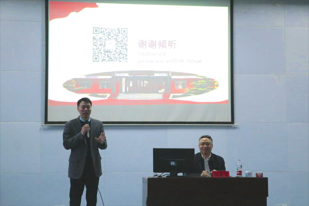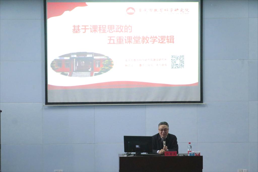 为助力马院学子全面理解课程思政,进一步增强其专业能力和素养,2023年3月16日16时,我院特邀重庆市教育科学研究院德育研究所副所长、重庆市首届市级科研骨干教师、中国教育学会班主任专业委员会理事、重庆市研学旅行协会副会长杨昌义于陈性初学术报告厅开展以“基于课程思政的五重课堂教学逻辑”为主题的学术讲座,我院副院长姜土生教授主持本次讲座并对杨副所长的到来表示热烈欢迎,2022级研究生、2021级本科生聆听了本次讲座。