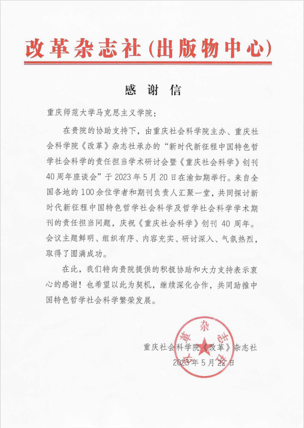 来自重庆社会科学院《改革》杂志社的感谢信