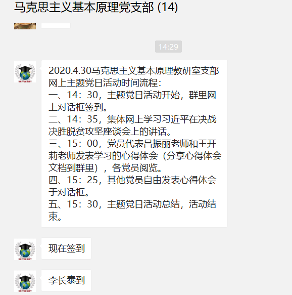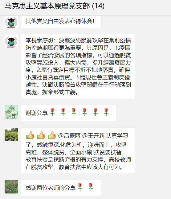 《人民日报》2020年03月07日第02版发表了习近平总书记《在决战决胜脱贫攻坚座谈会上的讲话》一文,脱贫攻坚工作艰苦卓绝,收官之年又遭遇疫情影响,为认真学习习近平总书记关于疫情防控和脱贫攻坚方面的重要讲话精神,我院马克思主义基本原理概论教研室支部于2020年4月30日下午在微信支部群中开展了以学习“在决战决胜脱贫攻坚座谈会上的讲话”为主题的线上党日活动。
