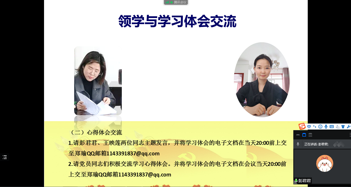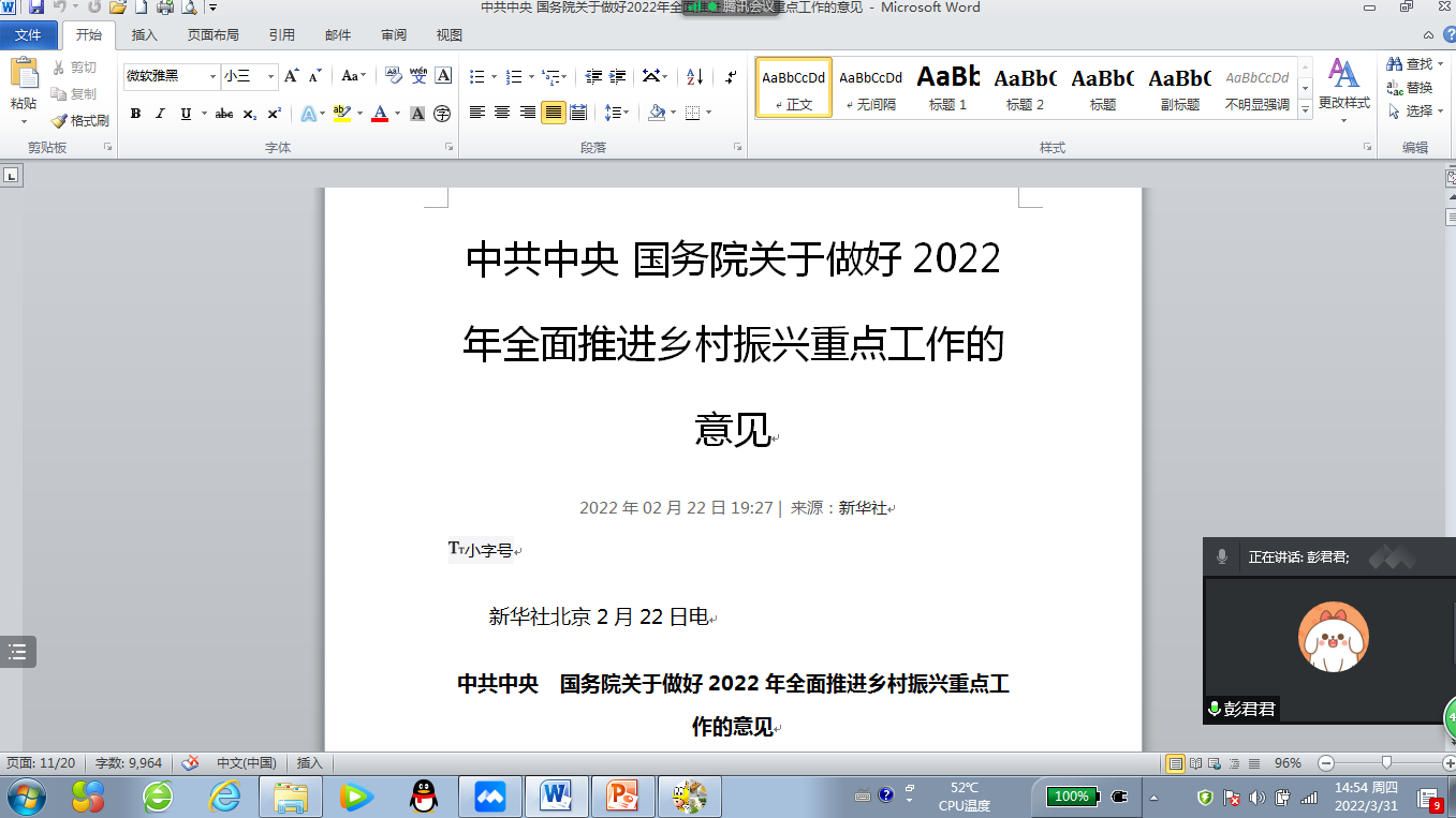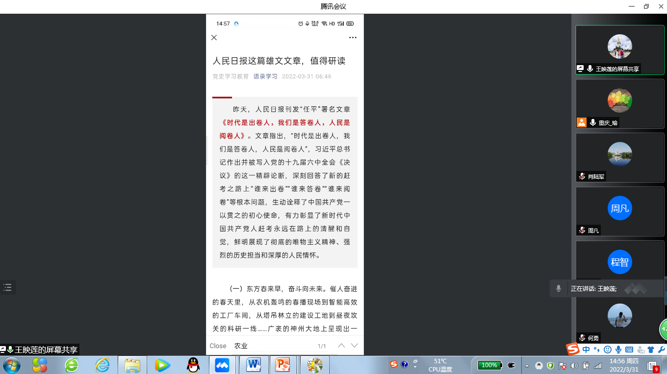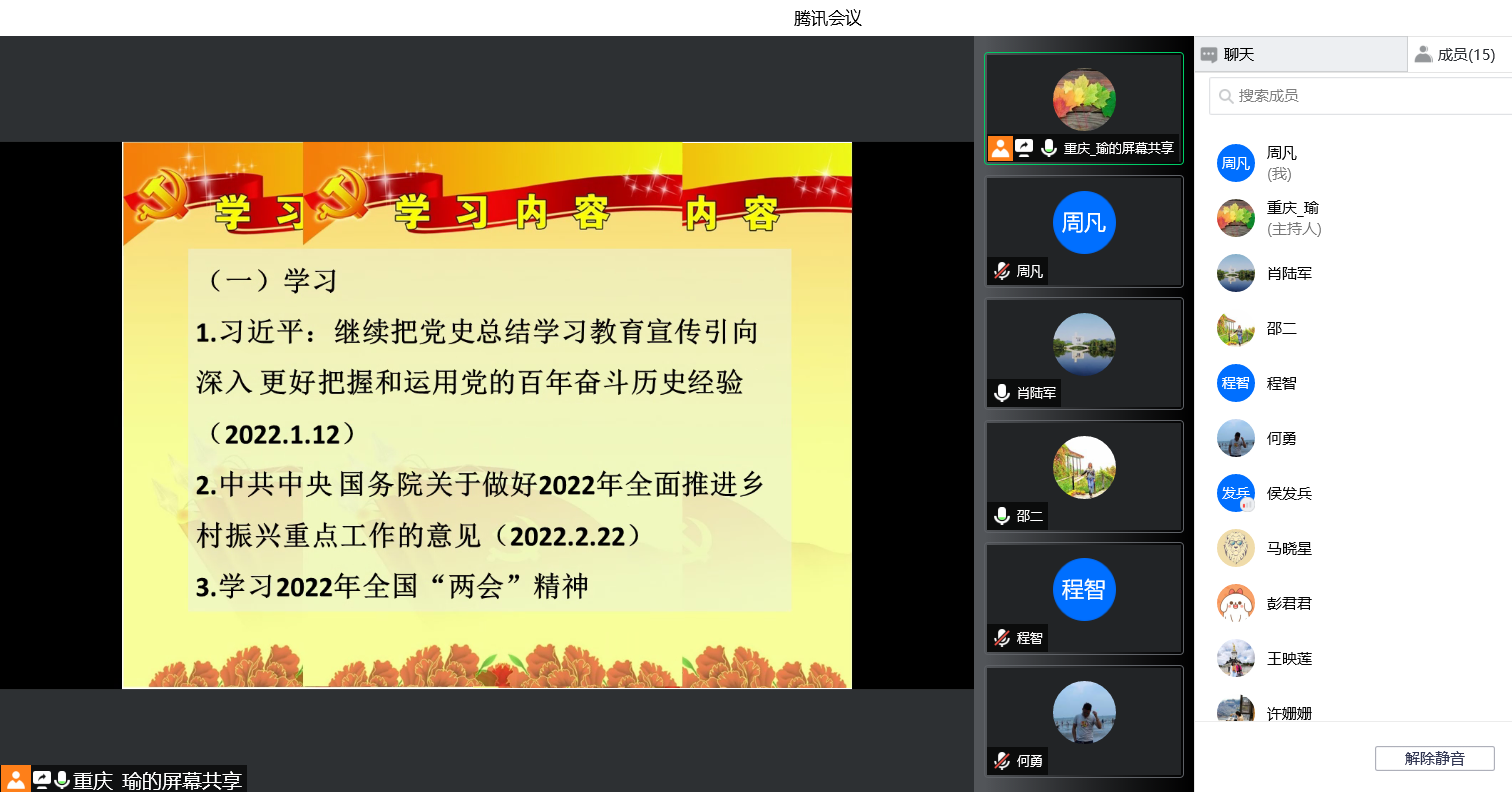 2022年3月31日下午,我院“概论”教研室党支部通过腾讯会议召开线上支部党员大会,组织开展3月主题党日学习活动,重点学习了2022年1月11日习近平总书记在省部级主要领导干部学习贯彻党的十九届六中全会精神专题研讨班开班式上发表的《继续把党史总结学习教育宣传引向深入 更好把握和运用党的百年奋斗历史经验》重要讲话,以及《中共中央国务院关于做好2022年全面推进乡村振兴重点工作的意见》主要精神。会上,彭君君和王映莲两位同志从乡村振兴战略的时代背景、机遇挑战、具体举措和重要意义等方面交流了学习心得,祝玉峰等同志踊跃发言,谈了各自的学习体会。通过学习,全体党员加深了对党的百年奋斗历史以及乡村振兴战略的理解和把握,为进一步提升课堂教学质量打下了坚实的基础。