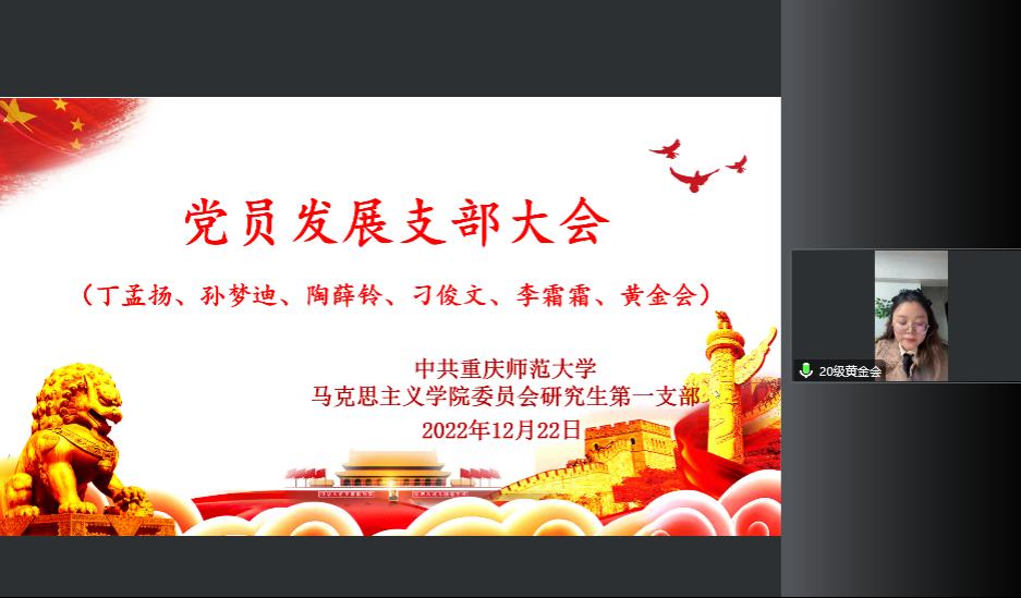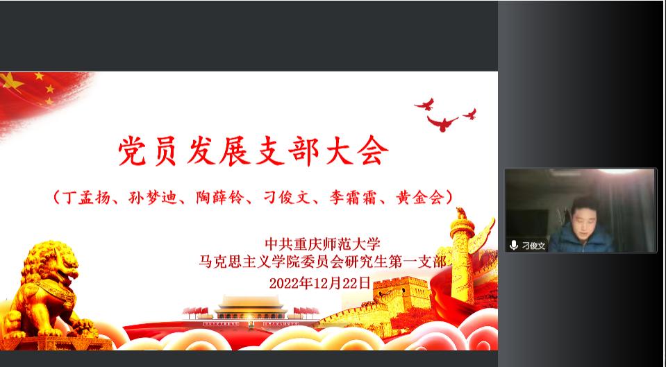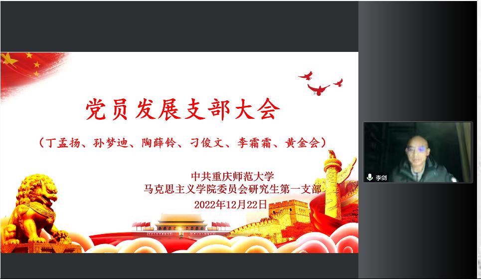 为吸收新党员、为党注入新鲜血液,推进党的基层组织建设。2022年12月22日晚上19点,学院研究生第一支部采用线上与线下结合的方式,通过腾讯会议平台开展云端“党员发展支部大会”接收预备党员,会议由支部书记李剑同志主持。