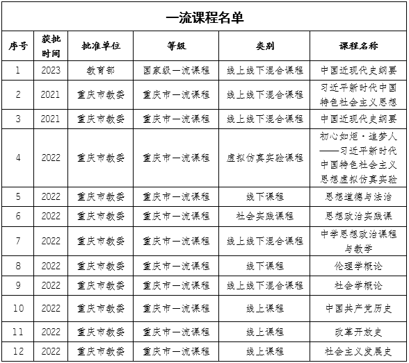 首先,一流课程建设成绩突出。三年来,获批1门国家级一流本科课程(学校共计6门国家一流课程)、11门重庆市一流本科课程(去除国家一流课程,学校共计56门重庆市一流课程)。课程类型涵盖虚拟仿真实验课等全部五个类型。市级以上一流课程数量在全校居首位。其中,2022一年里,获批重庆市一流课程9门。