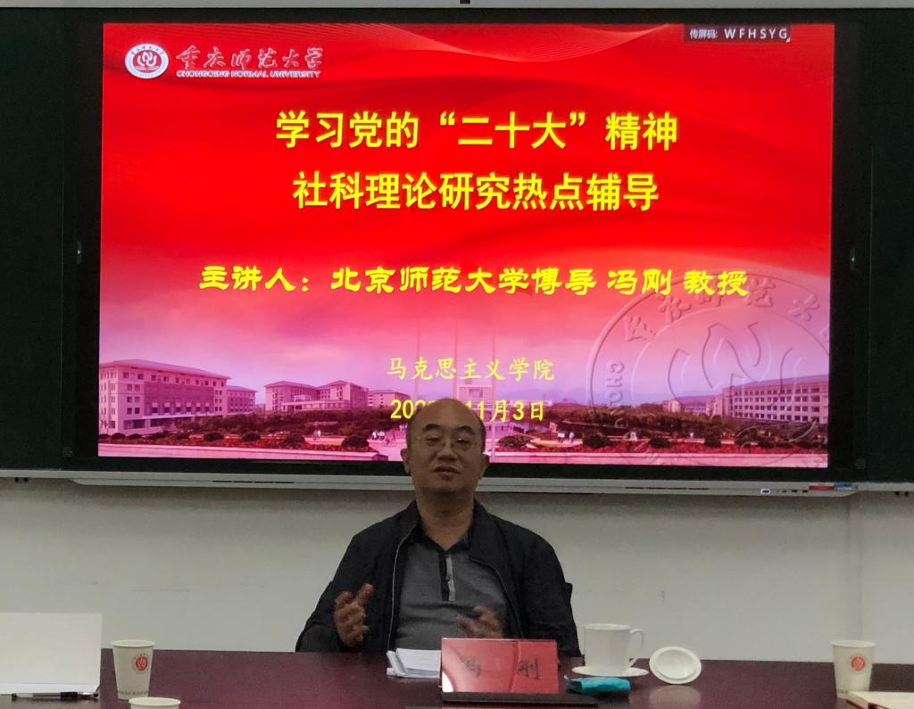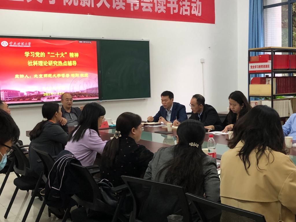 2022年11月3日下午4:30,为深入学习党的二十大精神,进一步深化对党的二十大精神的理解,促进党的二十大精神理论热点研究,北京师范大学博士生导师冯刚教授受邀到我院开展了题为“学习党的二十大精神 社科理论研究热点辅导”的主题分享会。本次分享会在汇贤楼107会议室召开,我院党政班子、系部教研室主任和行政人员参加。活动由副院长姜土生教授主持。