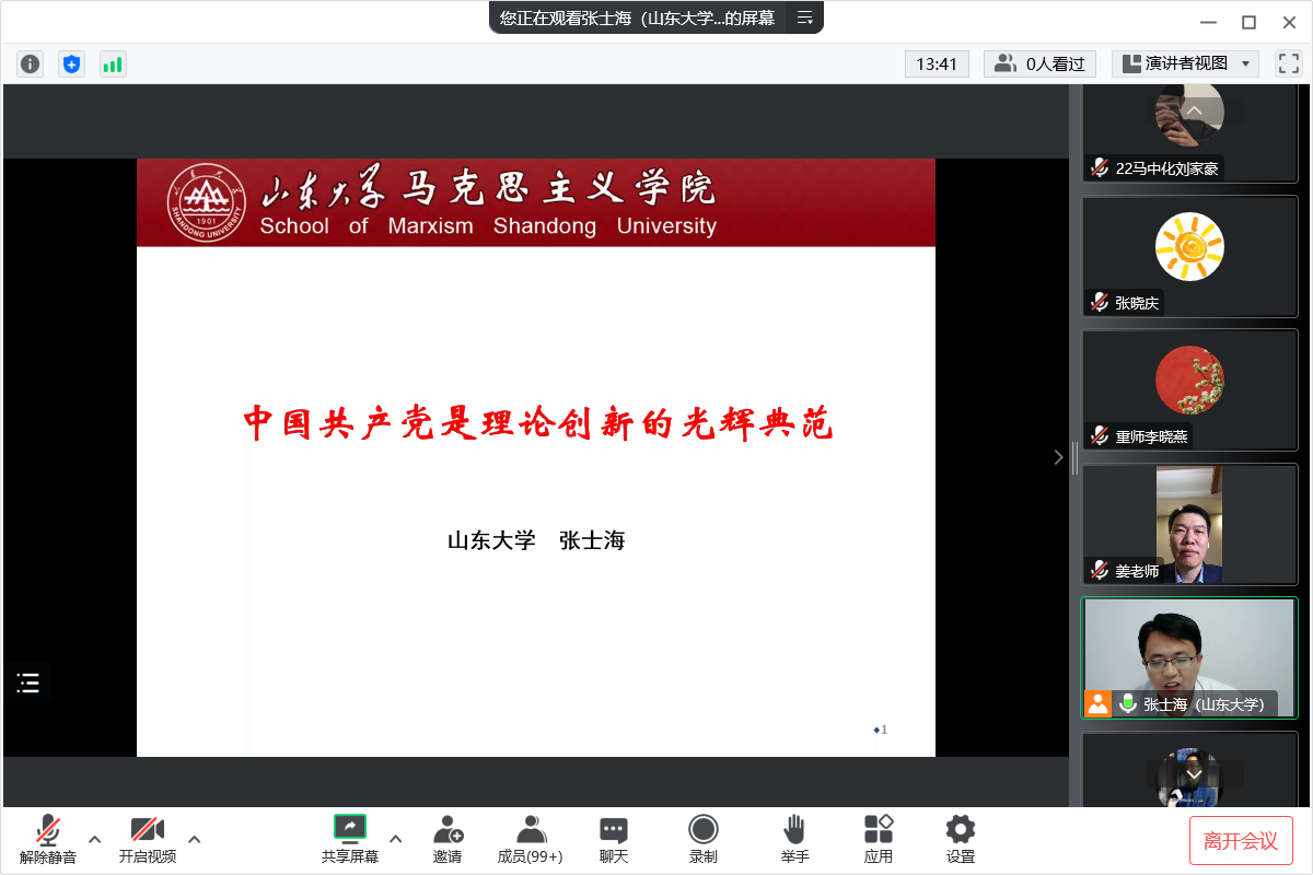 为进一步深入学习宣传贯彻党的二十大精神,2022年11月10日19:30,山东大学PA视讯集团院长、博导张士海教授应邀为我院师生作了题为“中国共产党是理论创新的光辉典范”的主题讲座。本次讲座系重庆师范大学马克思主义论坛(第9期)暨PA视讯集团26届研究生学术活动月系列活动。讲座由PA视讯集团副院长姜土生教授主持,我院近300名师生通过腾讯会议线上参会学习。