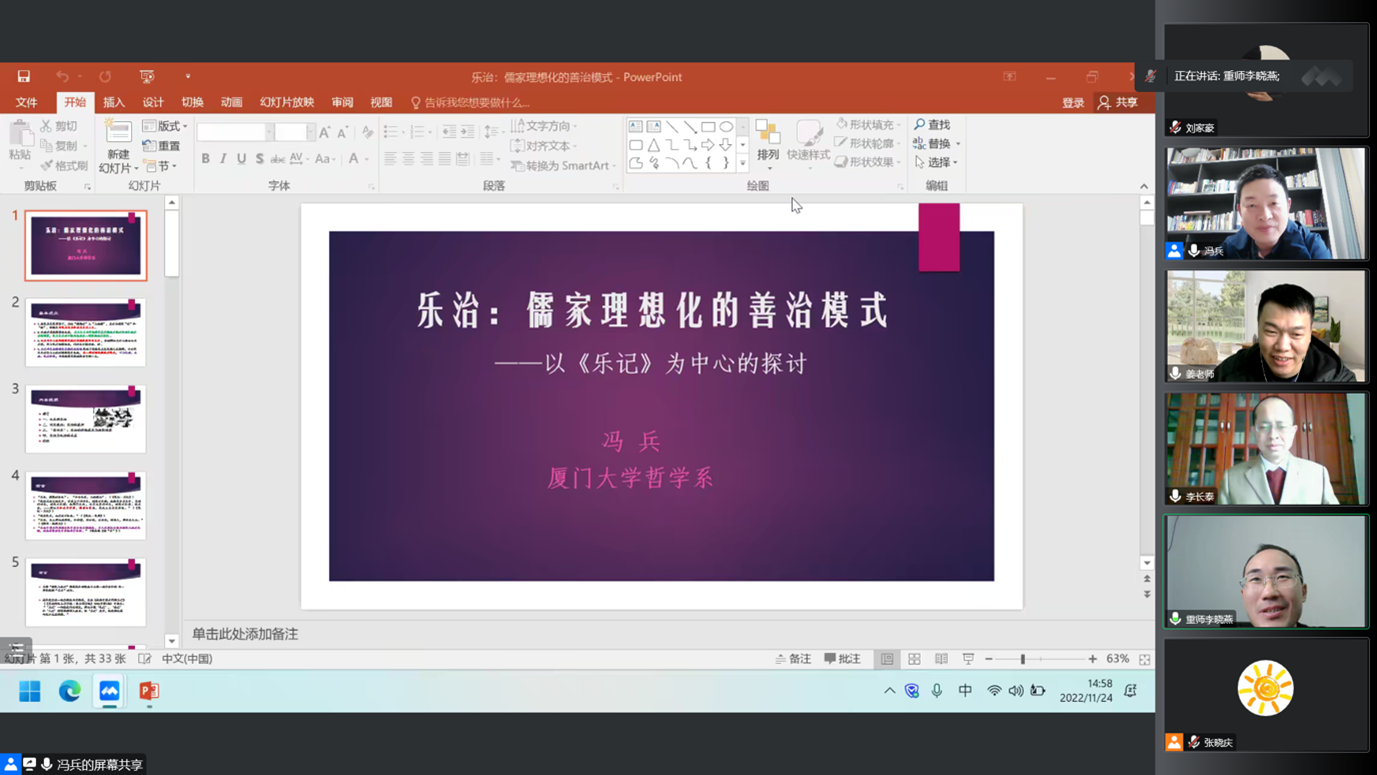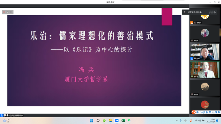 为进一步深入领略中华优秀传统文化的魅力,营造良好的学习氛围,2022年11月24日15:00,我院2007届校友、厦门大学哲学系冯兵教授应邀为我院师生作题为“乐治:儒家理想化的善治模式——以《乐记》为中心的探讨”的学术讲座。本次讲座系重庆师范大学马克思主义论坛(第10期)暨PA视讯集团第26届研究生学术活动月系列活动。我院近300名师生通过腾讯会议线上参会学习。本次讲座由李长泰教授主持。