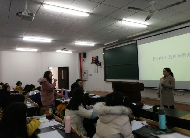 在讲座伊始,郑瑜老师对刘莉老师进行了一番介绍,让同学们认识到刘莉老师是一位实战经验丰富的中学老师。讲座一开始,刘老师就提出了三个问题,以问答的互动形式,让同学们快速地融入到讲座所谈论的话题中。讲座全程刘老师都围绕解决这些问题为中心,用许许多多的实际案例为我们讲述了教师是什么,教师应该做什么、为什么这么做、如何做,以及实习期间会遇到问题与解决方法等,让同学们从老师们积累的经验中少走弯路,为即将到来的实习和未来的教育之路积累更多能量。