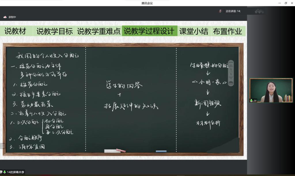 比赛伊始,14位选手在主持人介绍比赛规则、评分细则后按照抽签顺序轮流进行展示。选手们从教材分析、学情分析、教学方法、课堂设计、板书设计和教学反思等方面进行详细阐述,准备充足、认真严谨、匠心独运,充分展现了我院师范生良好的专业素养。其中,7号选手以《中国特色社会主义进入新时代》为题展开说课,课程以情境展开,重点明确,层层递进,生动有趣,课堂设计合理,语言表达流利顺畅。10号选手选题为《我国的社会保障》,说课过程语言清晰,课堂导入方式独特,教学思路明朗、深入浅出,教学设计符合学生认知规律,表现出选手较强的教学设计能力。