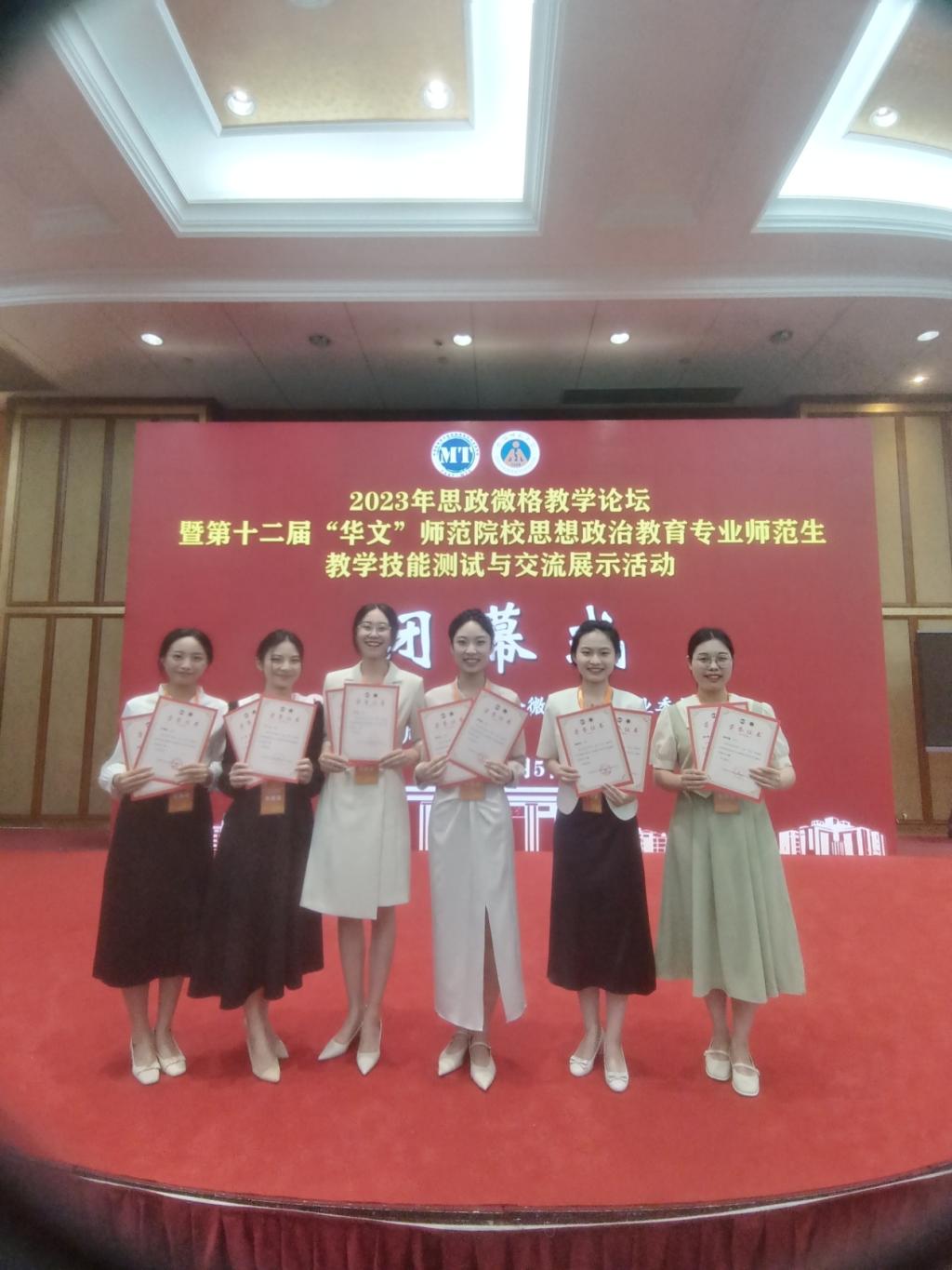 我院政教系主任左秋明教授、副主任郑瑜副教授率团队出征,并喜获佳绩,6位同学共获一等奖5项、二等奖7项(详见名单)。其中,受教学设计测试大赛邀请,郑瑜副教授担任本次大赛的评委,并作为颁奖嘉宾为选手颁发获奖证书。本次比赛可用“赛前准备充分扎实、以赛促强不负期待、初心如炬展望新篇”三句话来形容。